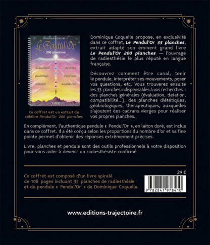 Dominique Coquelle propose, en exclusivité dans ce coffret, un extrait de son grand livre Le Pendul’Or 200 planches, l’ouvrage de radiesthésie le plus réputé en langue française.